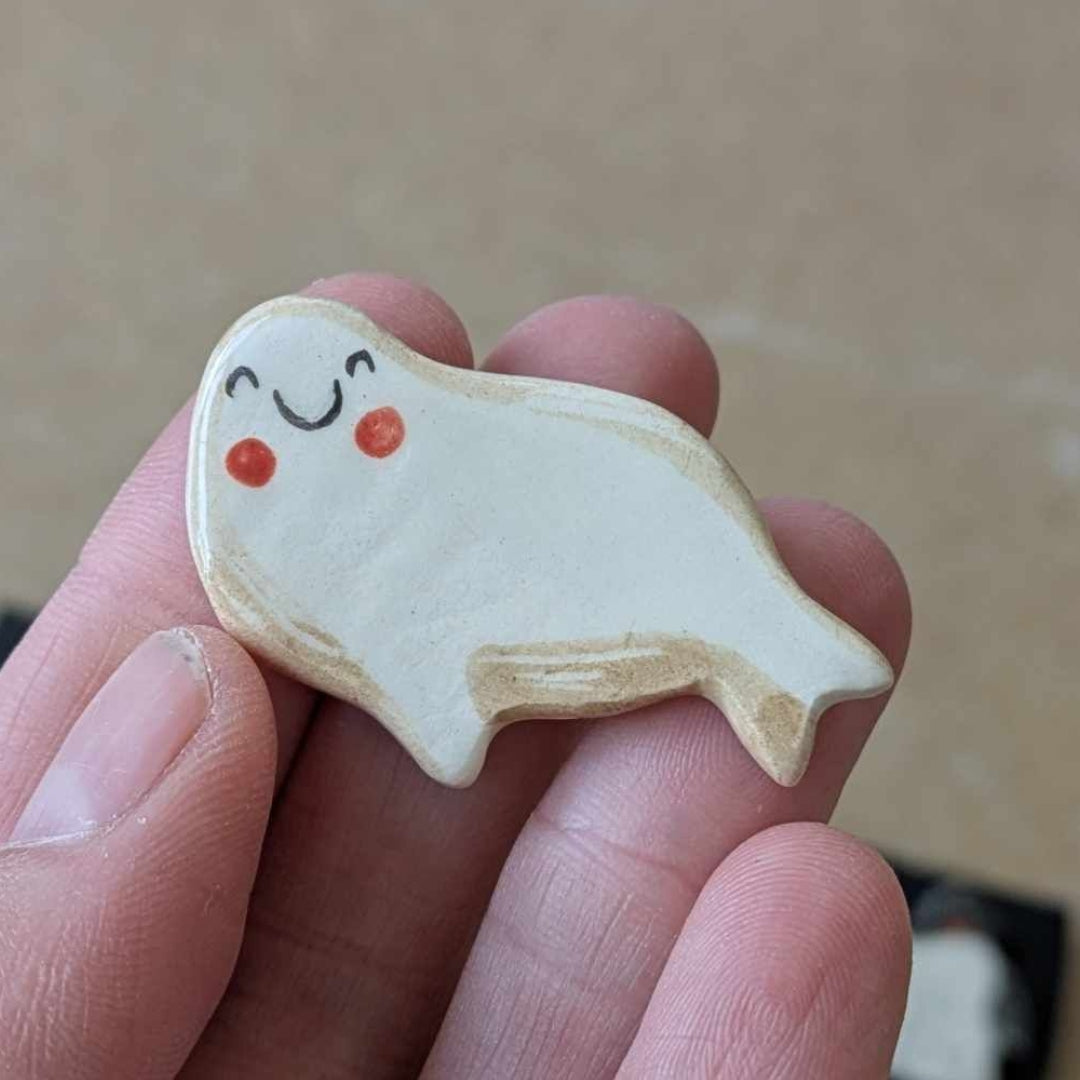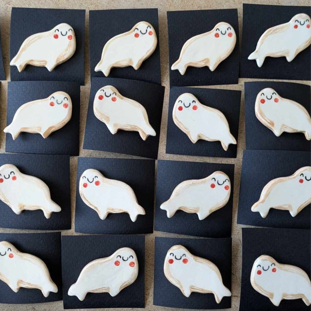 Papuošalai pagaminti iš keramikos. Iš balto molio nulipdytos formos išdegamos 1000 laipsnių temperatūroje, tada išpaišomos rankomis, padengiamos bespalve glazūra ir išdegamos antrąkart. Metalinė ženkliuko adatėlė pagaminta iš nerūdijančio plieno, kitoje pusėje užspaudžiama tvirta kietos gumos detale.