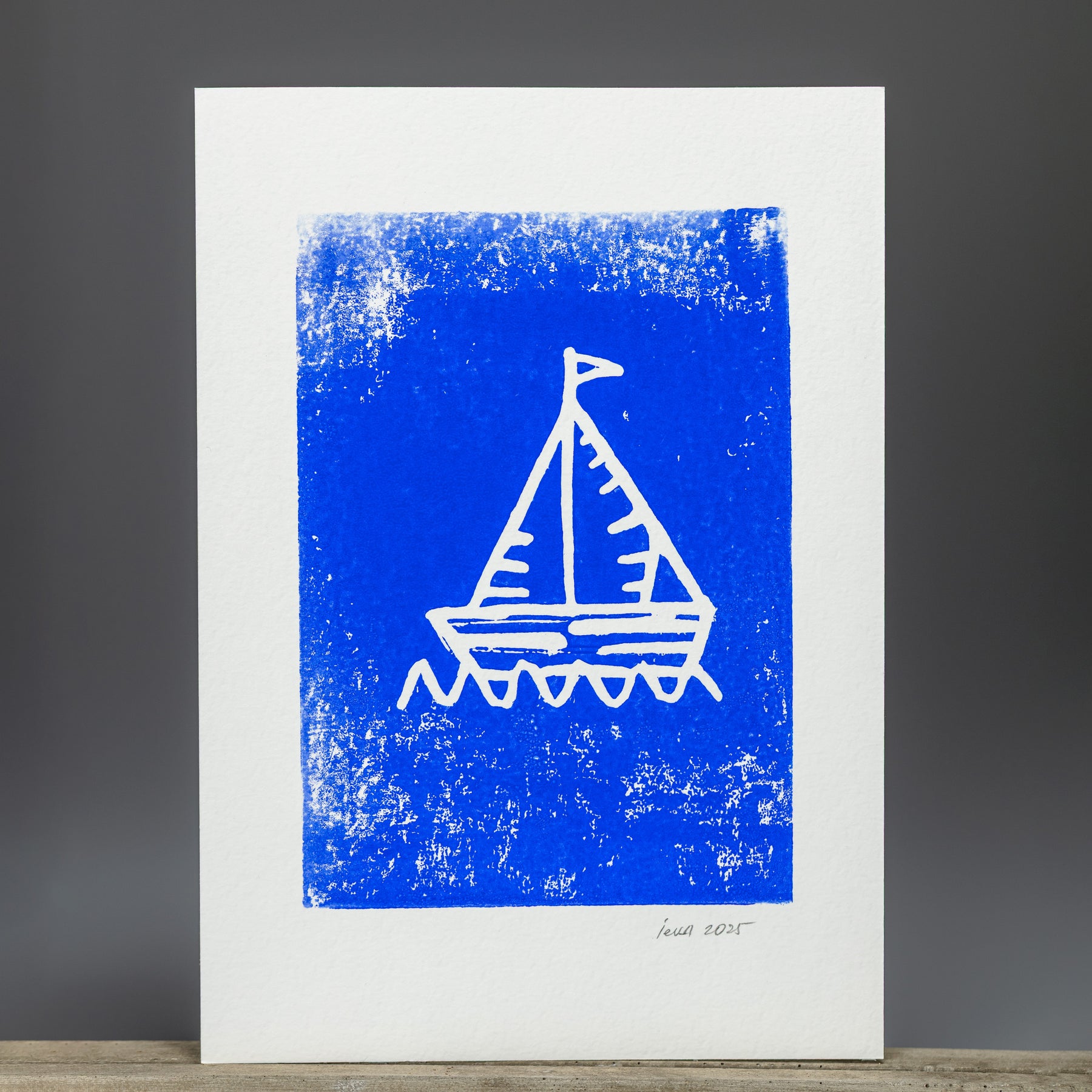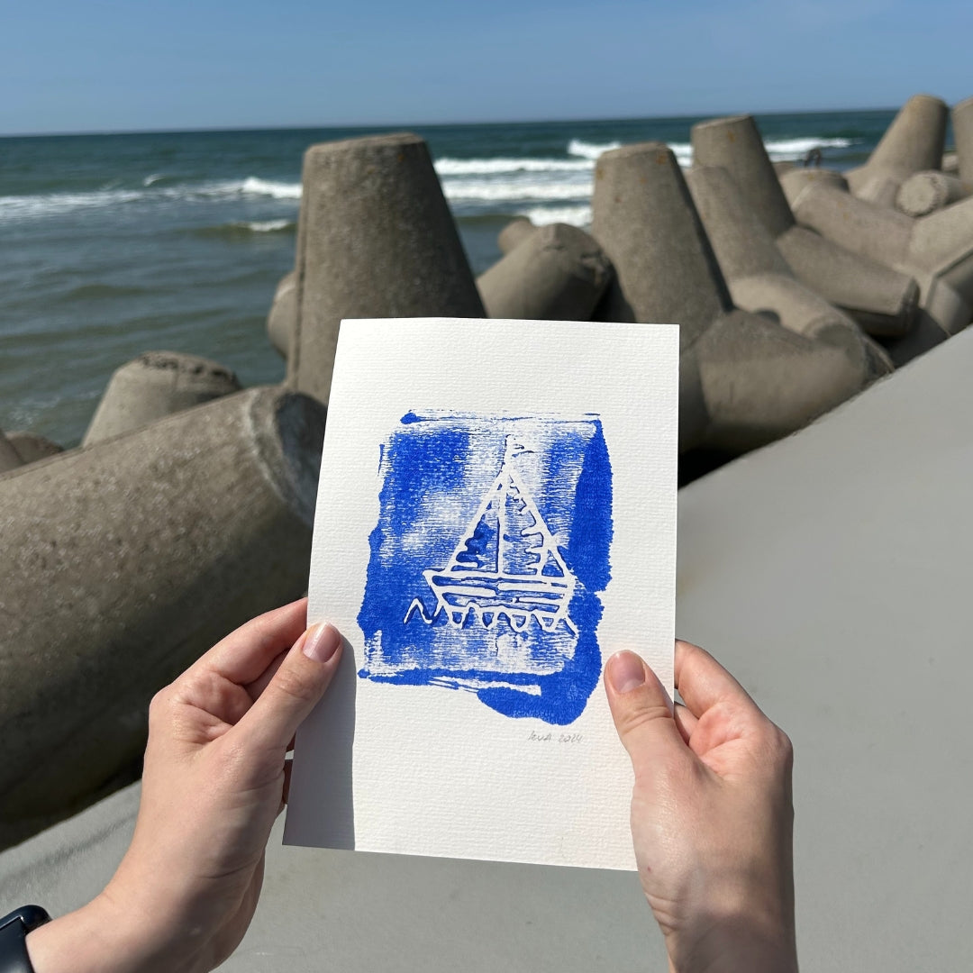 Rankų darbo lino raižinio atvirukas.