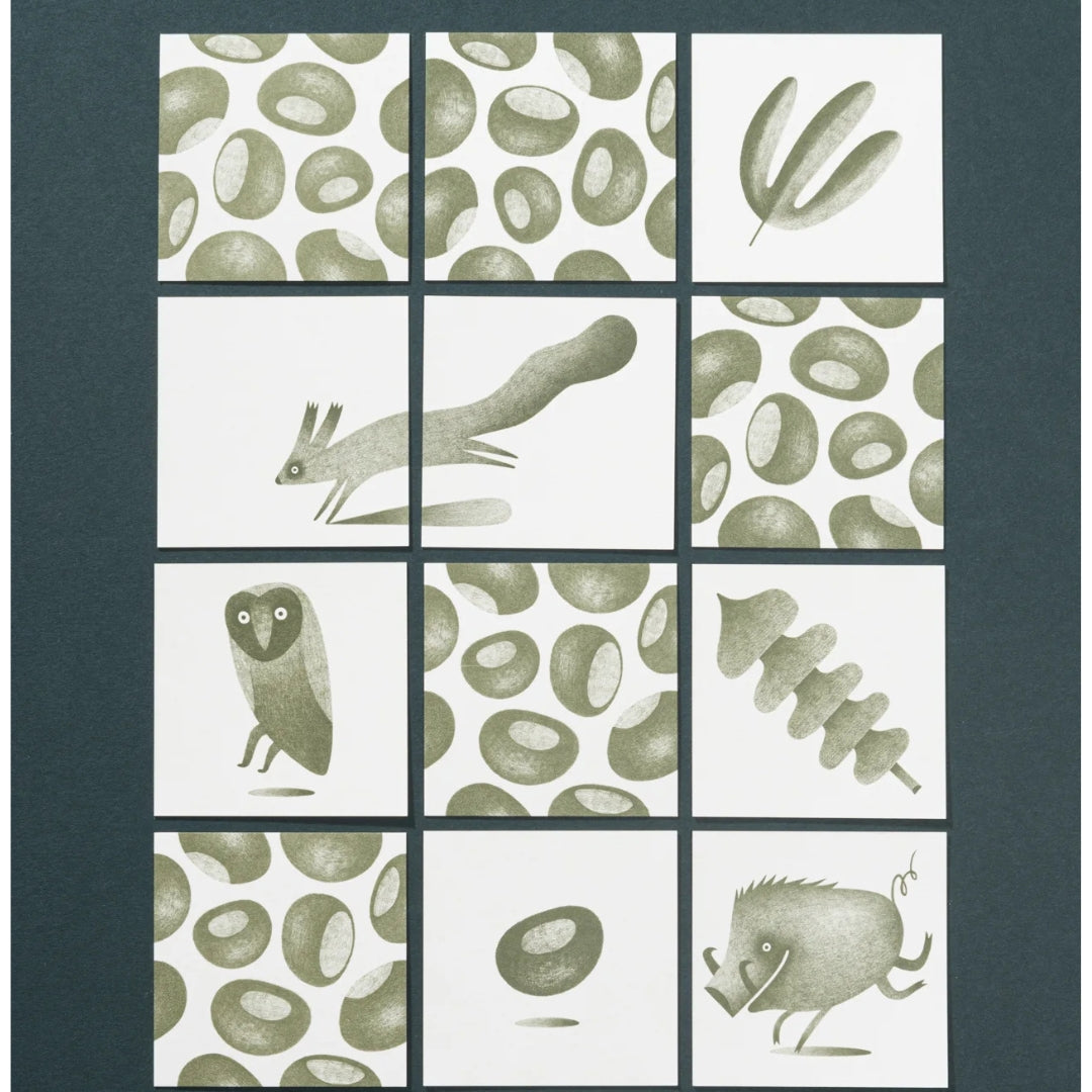 Dėžutės viduje rasite 18 porų (36 kortelės) kortelių su linksmais gyvūnais iš Čekijos miškų. Šio žaidimo ypatybė yra ta, kad 3 poros porų visada sudaro vieną iliustraciją, kurią turite atrasti!