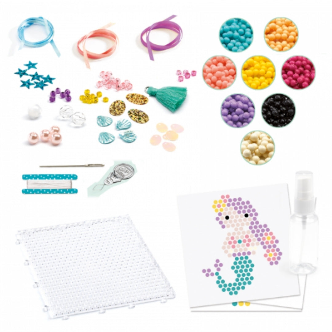 Susikurk savo žavesį! Karoliukai prilimpa vienas prie kito, kai jie yra aktyvuojami vandeniu. Plokštė laikys karoliukus savo vietoje, kol dirbsite ties dizainu. Komplektą sudaro 3 dizaino formos, 1 lentynėlė su kabliukais, siūlai, adata ir siūlų vėriklis, daugiau nei 500 karoliukų bei įvairūs aksesuarai, skirti sukurti jūsų žavesiui.