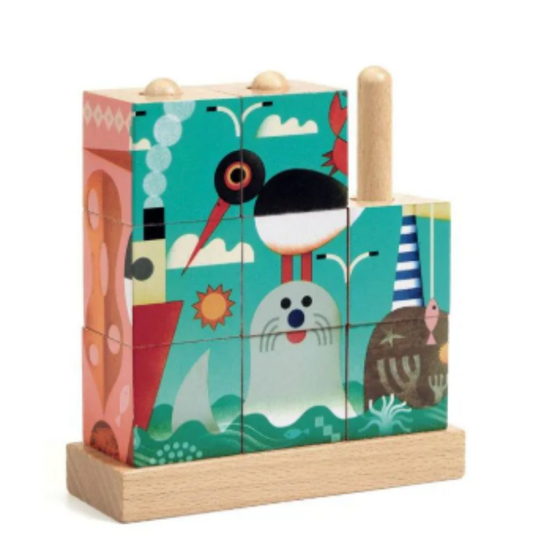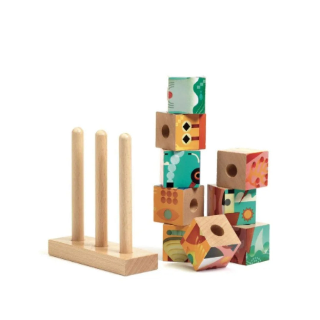 4 gyvūnų dėlionės. 9 medinės kaladėlės suveriamos ant prie medinio pagrindo pritvirtintų 3 vertikalių pagaliukų. Rinkinyje pridėtos 4 pavyzdžių kortelės, padėsiančios vaikams sudėlioti gyvūnus. Rinkinyje yra 1 medinis pagrindas, 9 medinės kaladėlės ir 4 pavyzdžių kortelės.