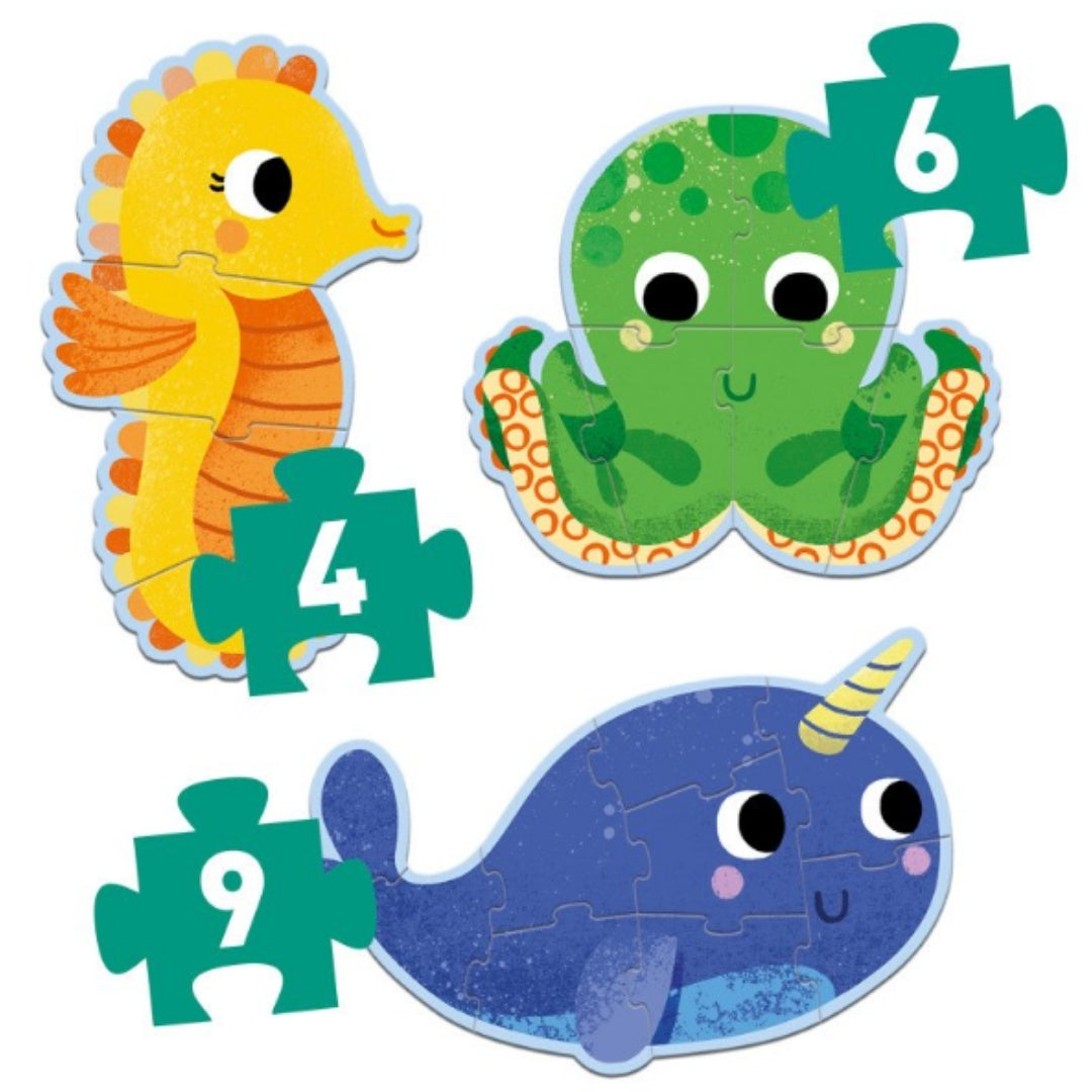 Iš dėžėje esančių detalių galima sudėlioti 3 dėlionės - iš 4, 6, ir 9 detalių. Storo kartono dėlionė su didelėmis, lengvai laikomomis rankose dalimis.