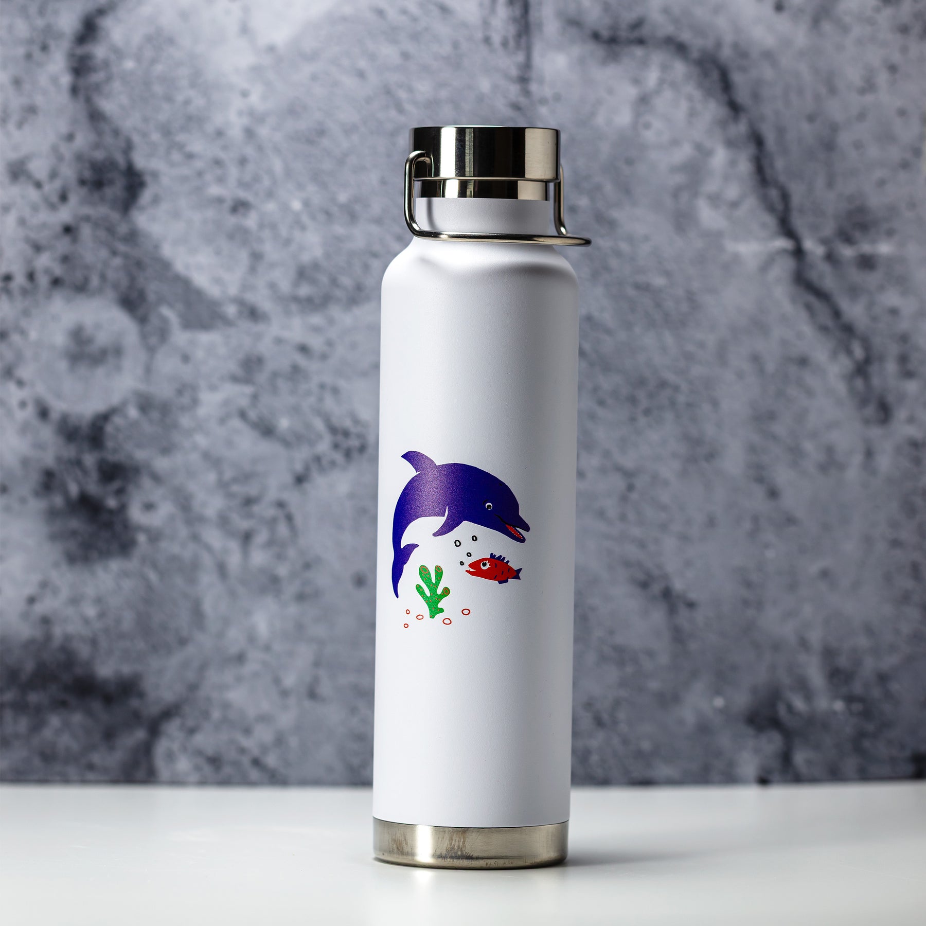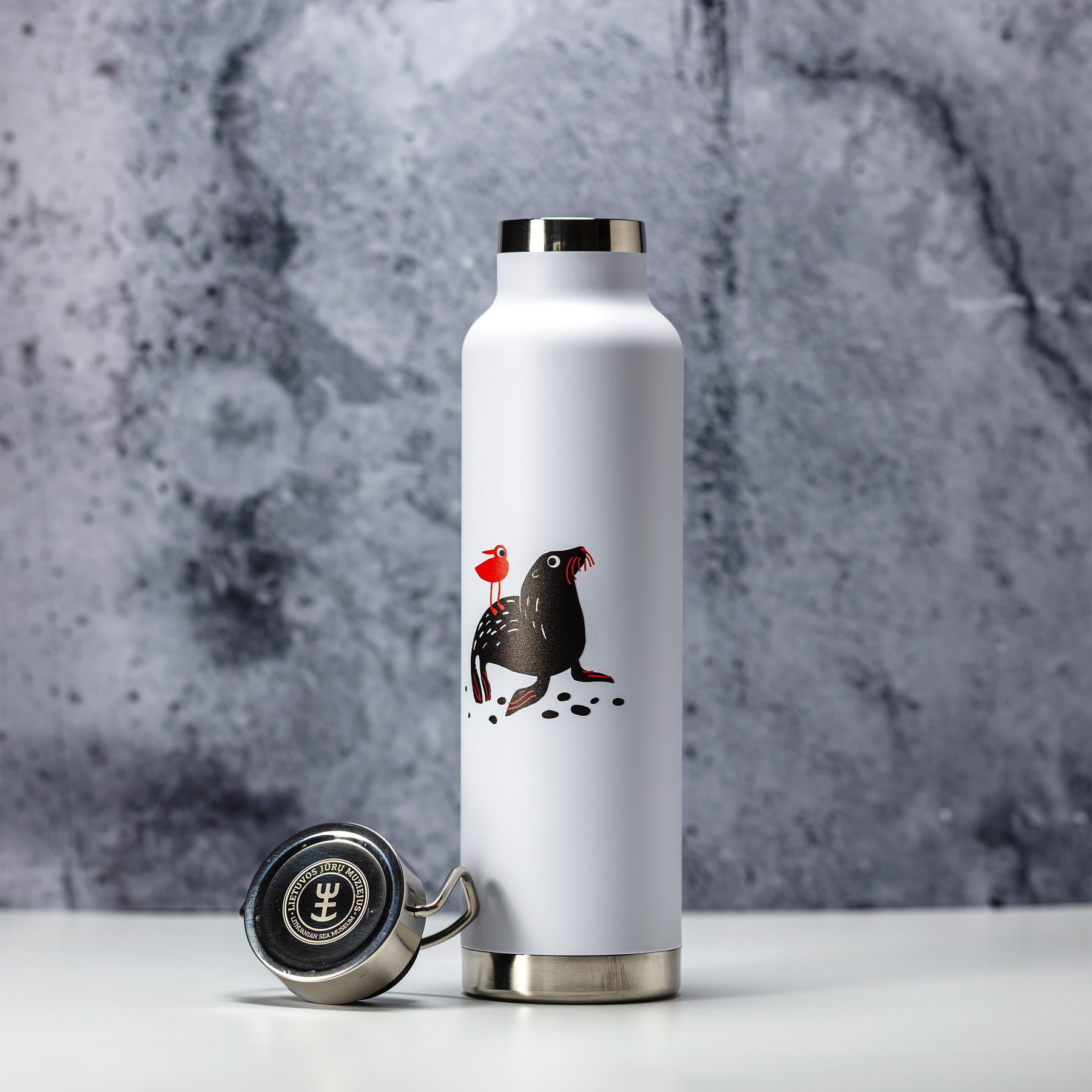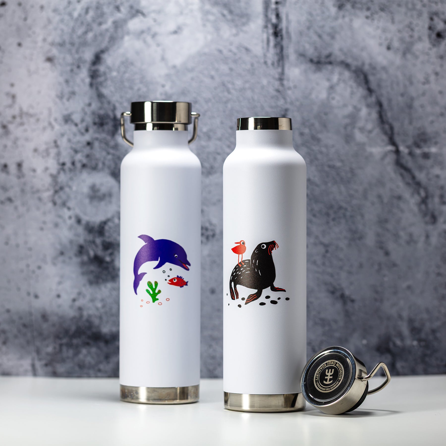 Išskirtinio dizaino stilinga metalinė termo gertuvė. Vieną gertuvės pusę puošia delfinas, o kitą – jūrų liūtas. Puiki dovana iškylų bei ilgų pasivaikščiojimų gerbėjams! Mėgaukis savo karštu gėrimu, kur bebūtum – jūroje ar sausumoje.