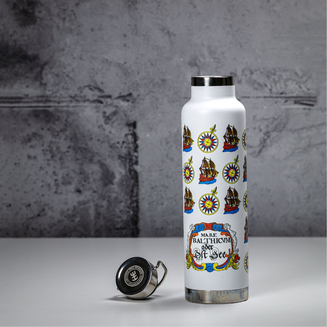 Išskirtinio dizaino stilinga metalinė termo gertuvė „Mare Balthicum“, kurią puošia laivų ir kompasų iliustracijos.