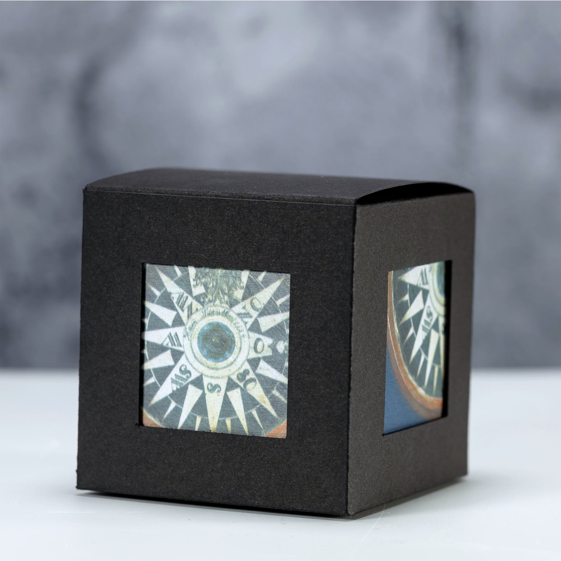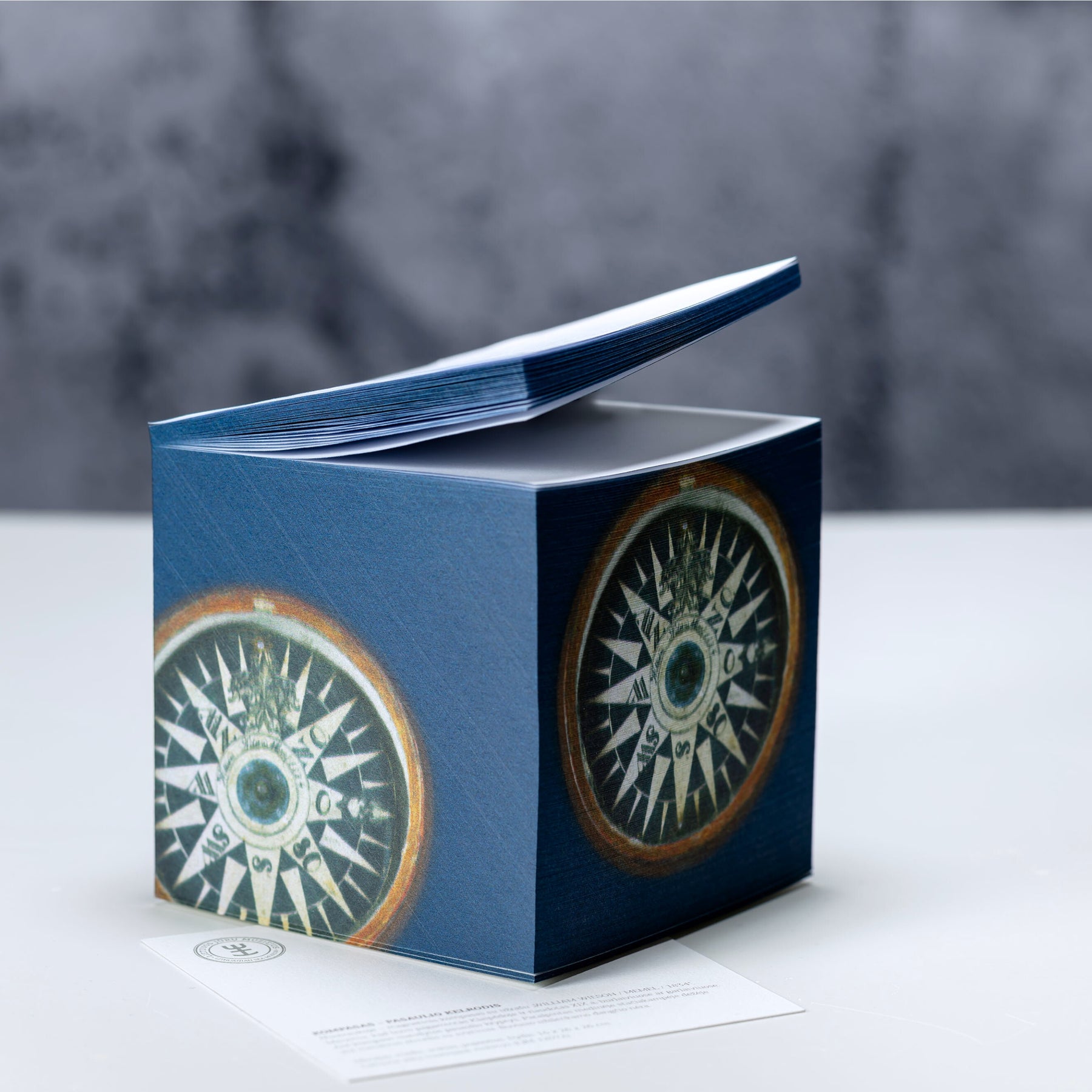 Išskirtinio dizaino plėšomų lapelių kubelis, kurį puošia eksponato – Klaipėdoje pagaminto kompaso – atvaizdas.