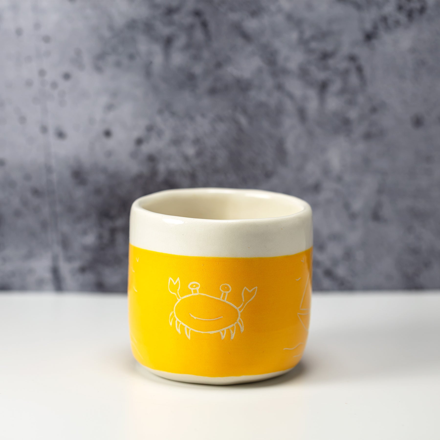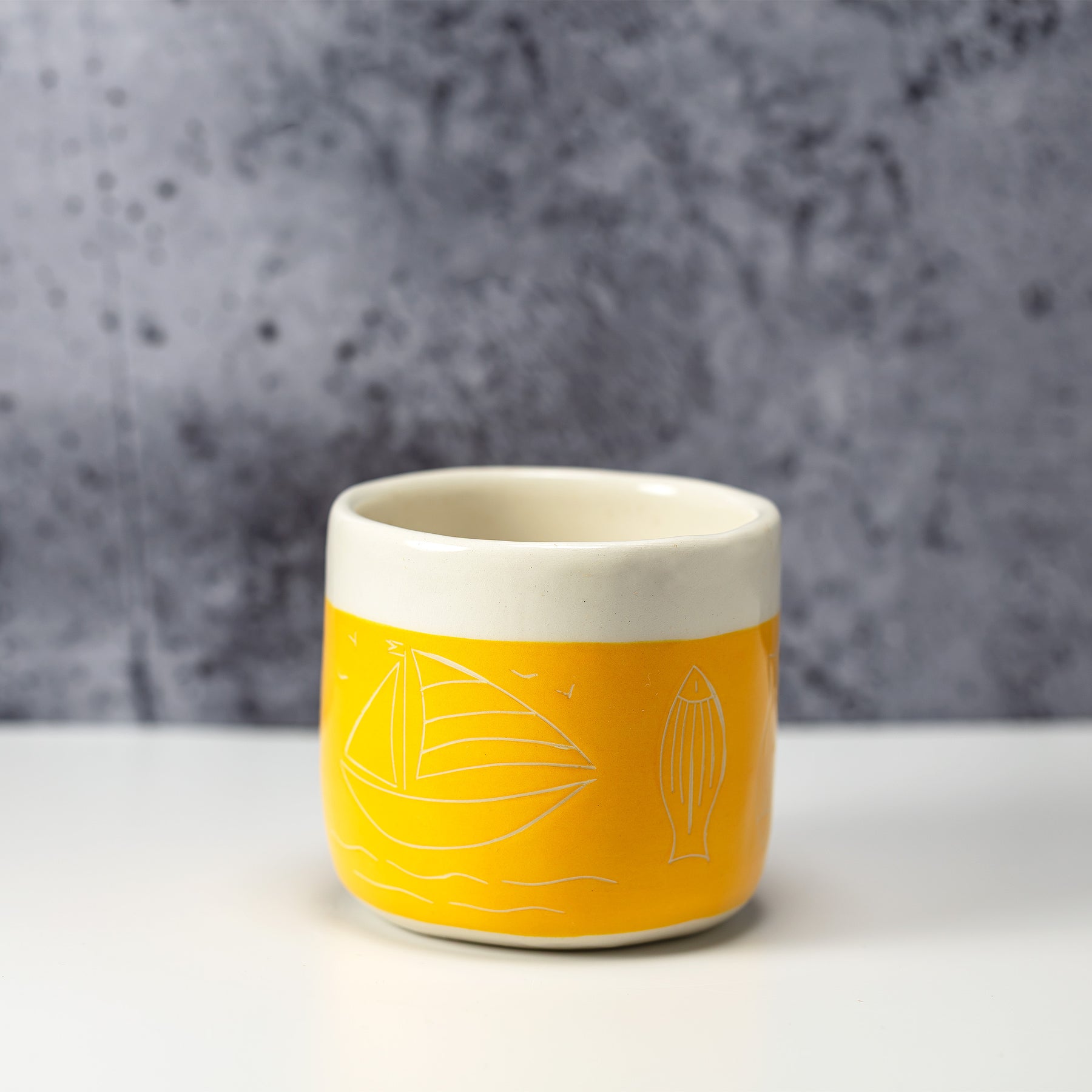 Rankų darbo balto molio keraminis puodelis, padengtas geltona glazūra bei nudailintas jūriniais motyvais. Kiekvienas puodelis yra unikalios formos, spalvos bei raštų.